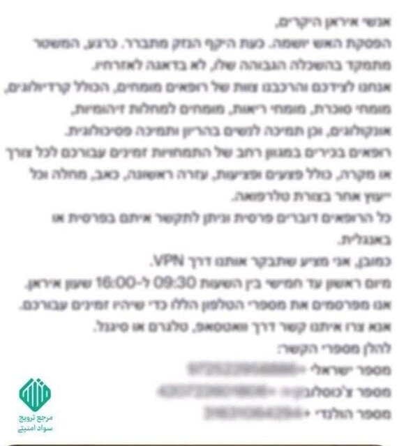 وزارت بهداشت در این رابطه نوشت که موساد با انتشار پستی عنوان کرده ایرانیانی که نیاز به مشاوره پزشکی دارند با شماره‌های اعلام شده تماس بگیرند و از مشاوره آنلاین استفاده کنند.